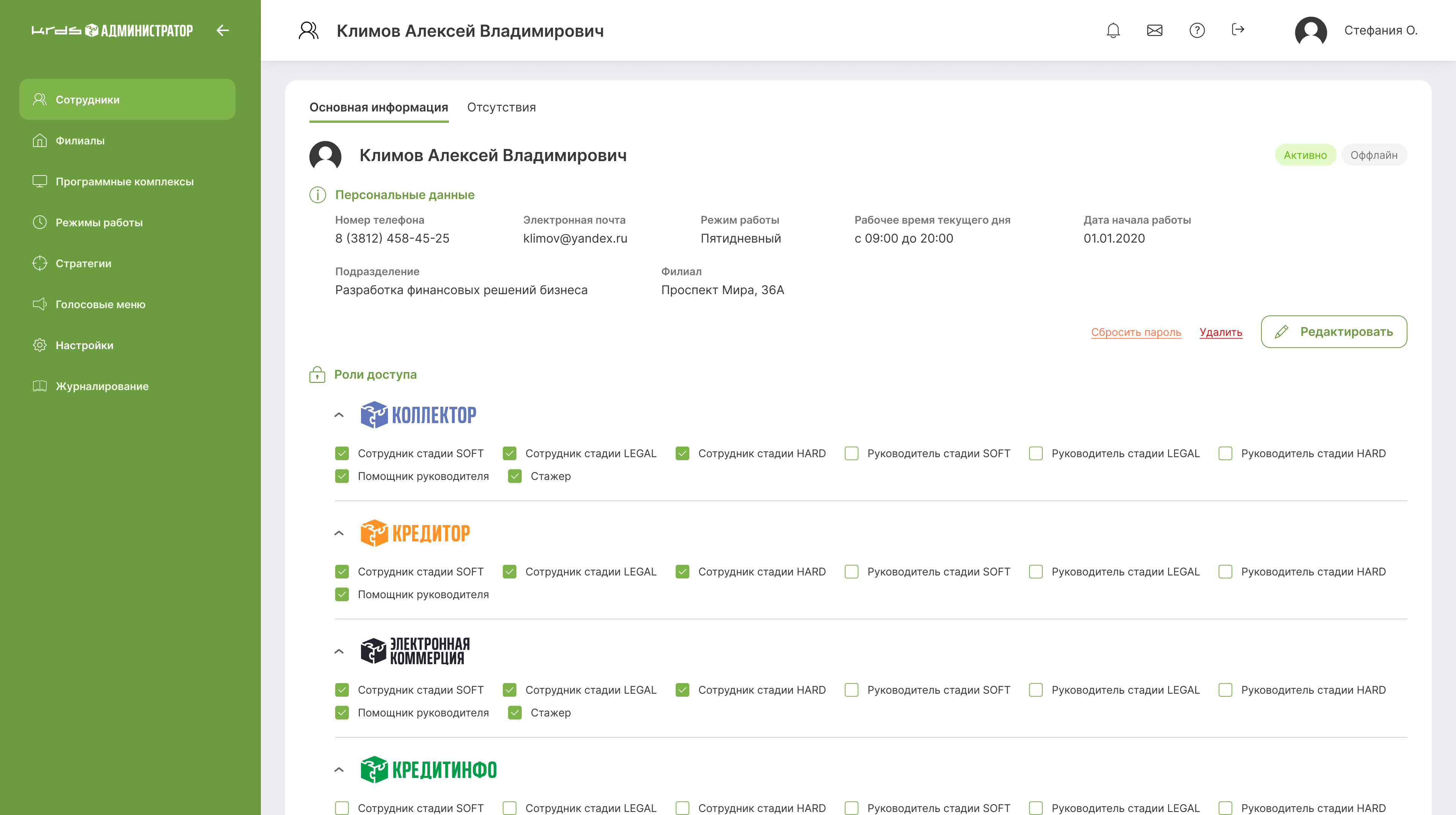 Программный комплекс для всестороннего администрирования элементов системы. Обеспечивает контроль структурных единиц организации и сотрудников, настройку ролей доступа, режимов работы, мероприятий, справочников, стратегий, телефонии и иных сервисов.